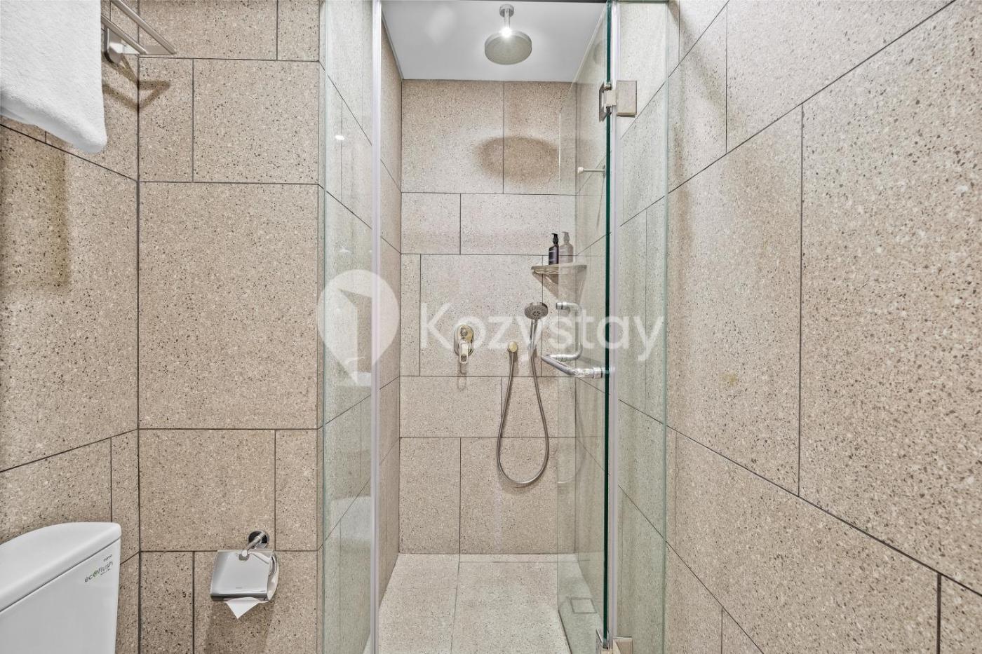 One-Bedroom Apartment. The air-conditioned apartment features 1 bedroom and 1 bathroom with a shower and a bidet. The well-fitted kitchen has a stovetop, a refrigerator, kitchenware and a microwave. Featuring a balcony with city views, this apartment also provides a seating area and a flat-screen TV with streaming services. The unit offers 1 bed.