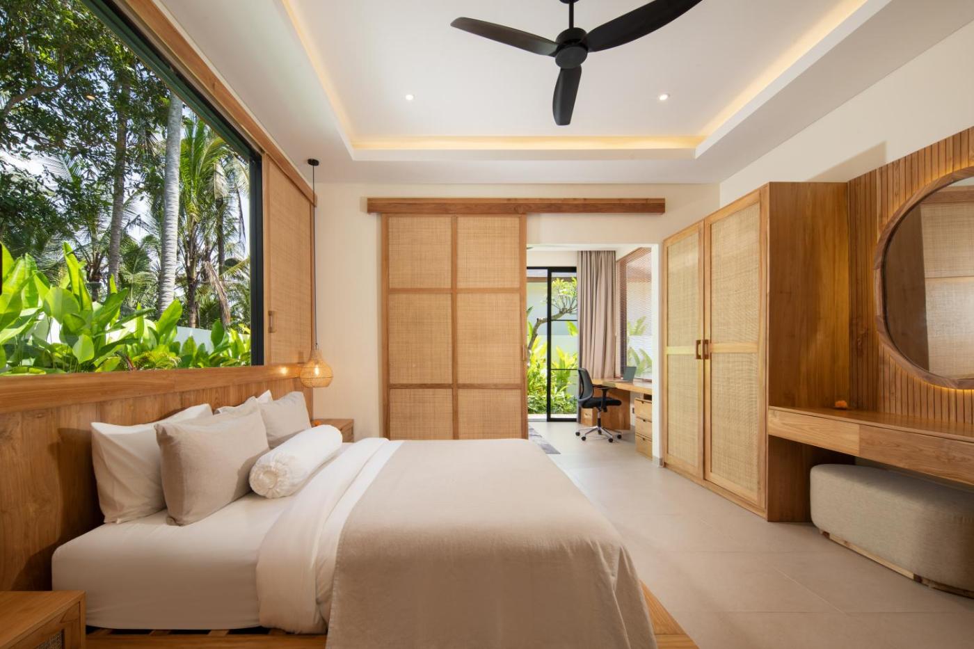 Three-Bedroom Villa. This villa features a infinity pool. Boasting a private entrance, this spacious villa also features 3 bedrooms, a seating area and 2 bathrooms with a walk-in shower and a bath. Meals can be prepared in the well-fitted kitchen, which has a stovetop, a refrigerator, an oven and a microwave. The air-conditioned villa features a flat-screen TV with streaming services, a washing machine, a tea and coffee maker, a dining area as well as garden views. The unit has 3 beds.